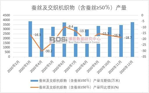 據博思數據發布的《2021-2027年中國蠶絲市場深度調研與投資前景研究報告》表明:2020年我國蠶絲及交織機織物(含蠶絲≥50%)產量累計值達38349.5萬米,期末產量比上年累計下降18.3%。